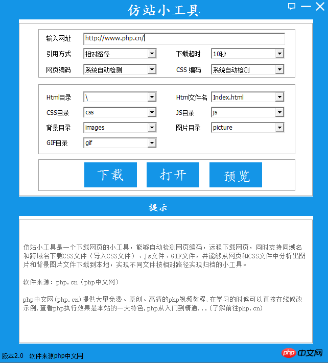 仿站小工具是通过网址下载静态网页的工具。从输入的网址下载html代码,提取出JS、Css、Image、Picture、GIF等静态文件网址,再从下载完好的Css代码中提取出Image静态文件网址,通过网址下载静态文件,根据软件设置好的保存规则,自动修正html和css代码链接路径,最终这些静态文件被按分类保存到电脑文件夹。